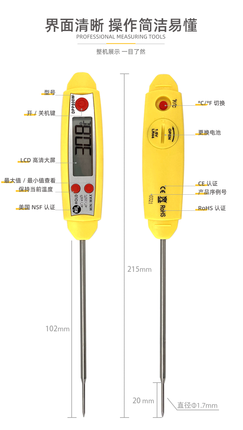 精确度±0.5°C(-10°C至100°C),其他±1.5°C