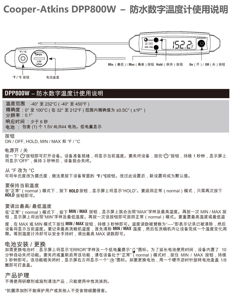• Cooper-Atkins DPP800W – 防水数字温度计使用说明0.56M点击下载