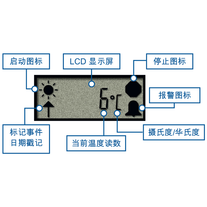 ºC 或 ºF 形式的温度值,支持启动、停止和报警图标闪烁