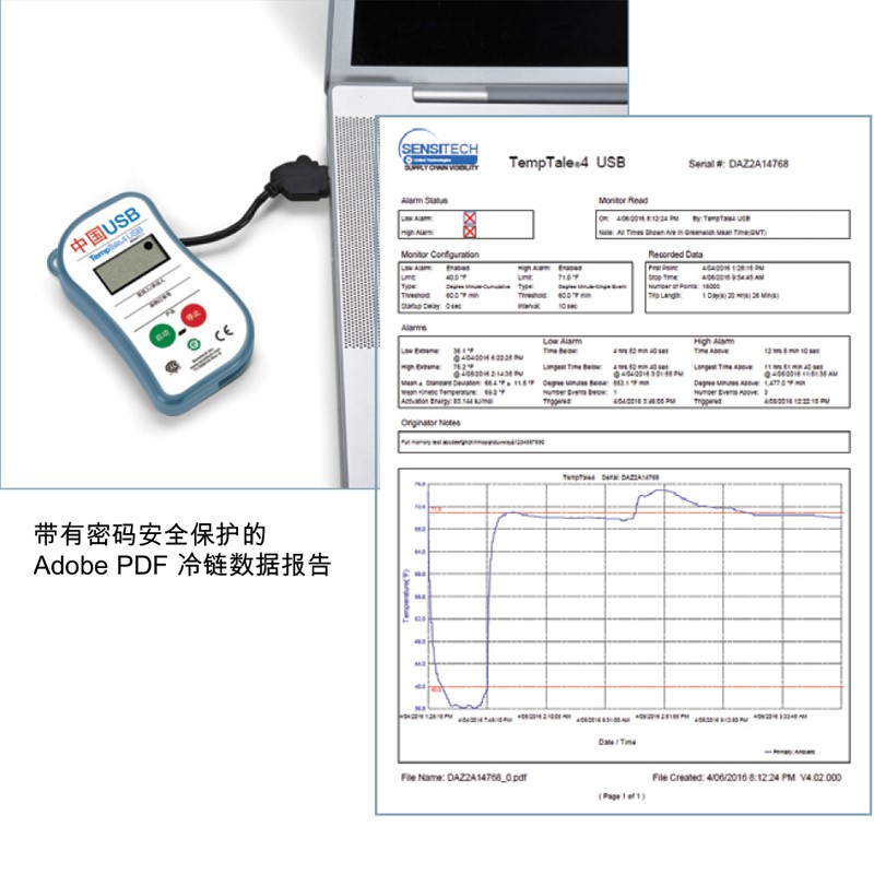 将中国 USB 监测器插入 PC 的 USB 端口后,该监测器将自动创建 Adobe®PDF 格式的冷链货运信息报告。此报告可通过任何兼容 Adobe 的阅读器程序(可免费广泛获取)查看,提供完整的冷链行程历史记录,便于在现场快速进行货运处理。借助电子邮件或其他文件共享功能,所有相关方均可即时轻松地查看货运信息。