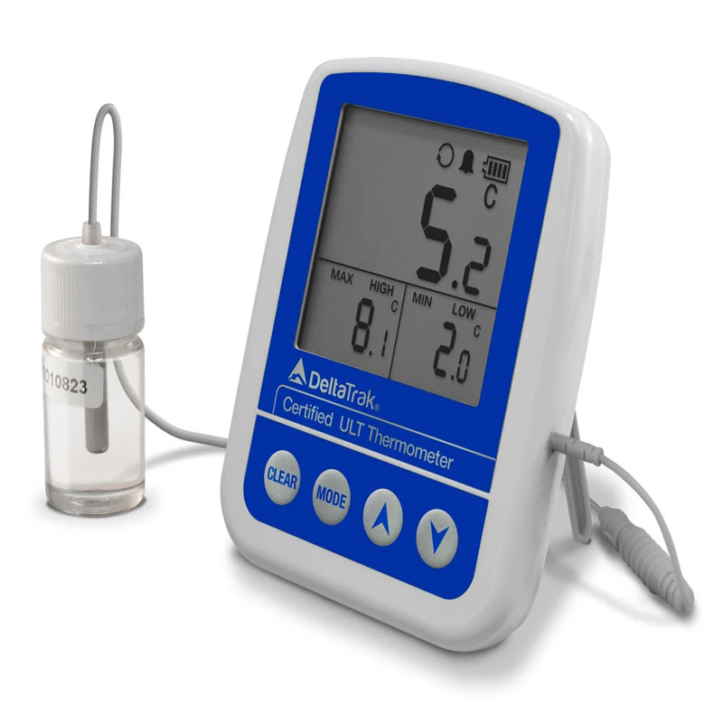 12238 认证报警温度计有最大最小值记忆,一个大尺寸、易于阅读的LCD屏幕和高低温报警设置功能。  这款温度计可监测冷冻器,冰箱内部或 冷藏保存柜的内部温度。 传感器带有一个3米厂的电缆线和一个不锈钢,密封在装有丙二醇溶液的塑胶瓶里的钝形探头。 这个瓶子设计可防止假报警,因为探头的测温不受由于正常使用下频繁开关冰箱或冻柜门导致的温度快速波动的影响。