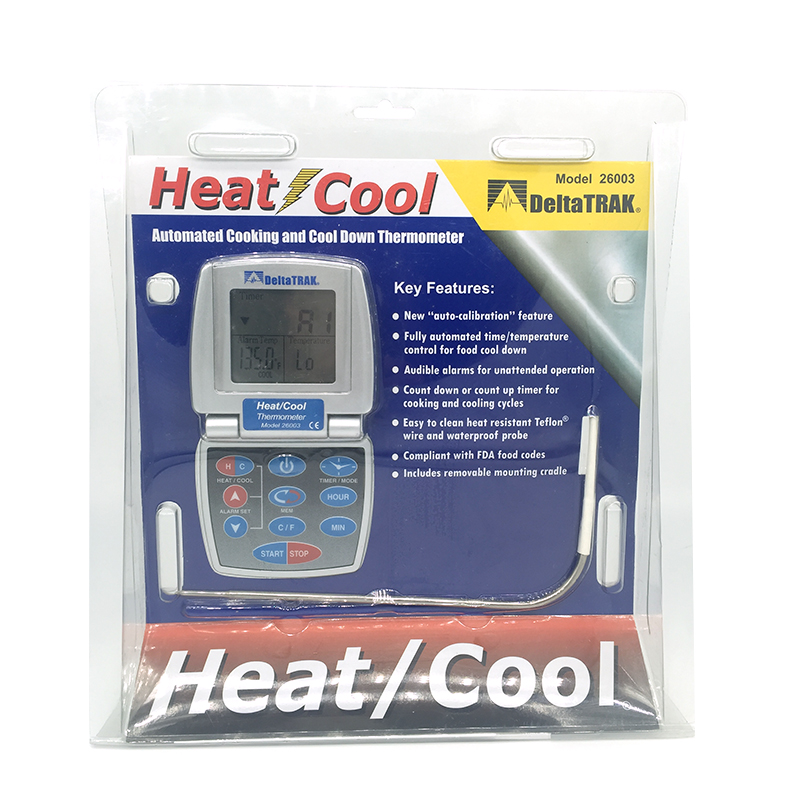 热/冷厨师烹饪温度计(型号26003)可查看内部烹饪温度。不需打开炉门,也无需猜测,因为警报发出的鸣笛声表示预先设定的温度已经达到了。它还跟踪食品的冷却步骤,以确保适当的冷却降温。配有2.5英尺的耐热铁氟龙延长线和6.5英寸的坚固不锈钢探针,可测温高达200°C!