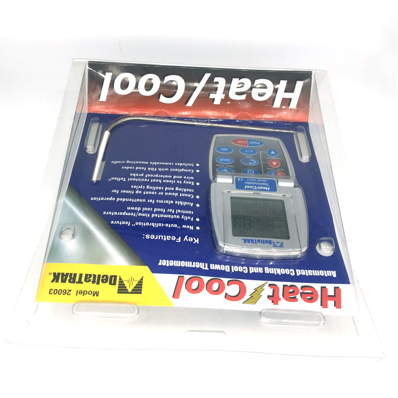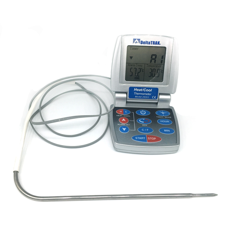 热/冷厨师烹饪温度计(型号26003)可查看内部烹饪温度。不需打开炉门,也无需猜测,因为警报发出的鸣笛声表示预先设定的温度已经达到了。它还跟踪食品的冷却步骤,以确保适当的冷却降温。配有2.5英尺的耐热铁氟龙延长线和6.5英寸的坚固不锈钢探针,可测温高达200°C!