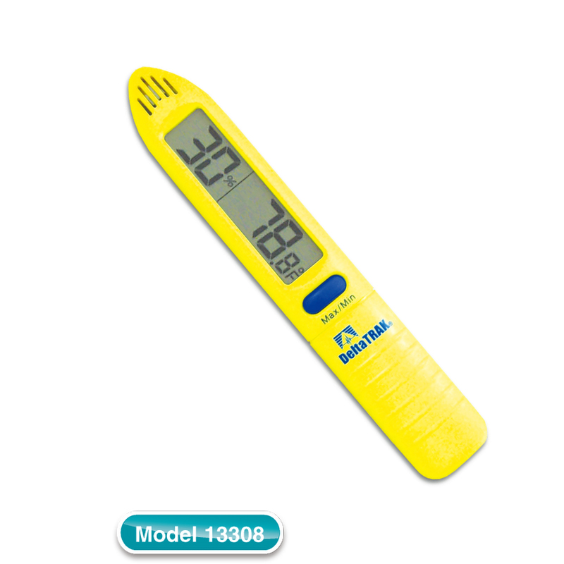 掌上型温湿度计,型号13308,是一个带别针的便携式温湿度计。外壳明黄能见度高,不易丢失。