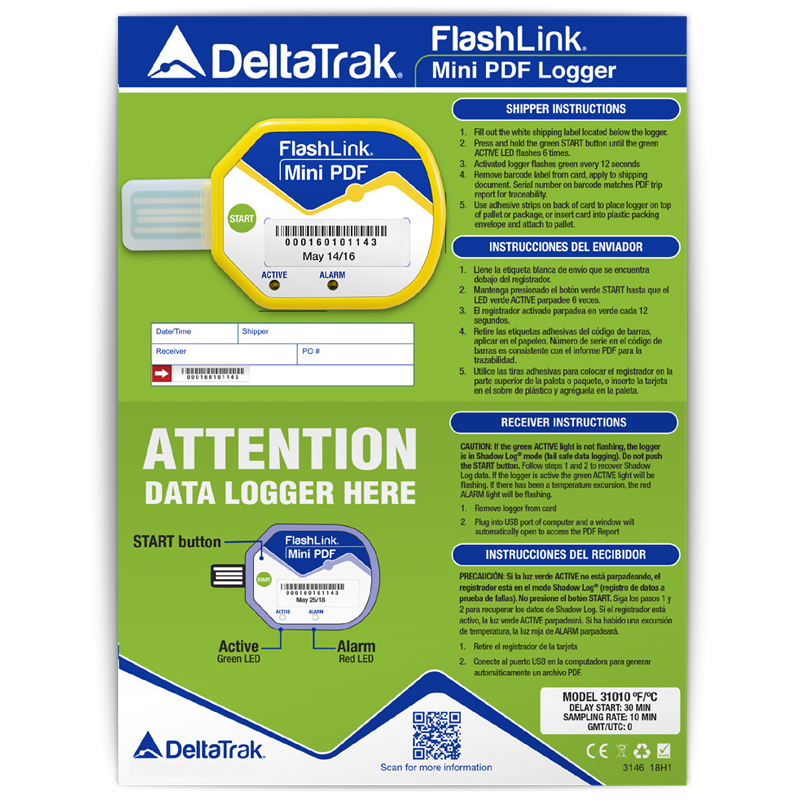 每个FlashLink®迷你PDF 在途数据仪记录都安装在一张亮绿色的运输卡上,便于在货物抵达时发现它。 该卡片有一个用于记录运输信息的区域,并具有可剥离的条形码标签,可以附在提单或其他运输文件上,以便追溯。 它还提供英语、西班牙语和中文的承运人和接收人指南。