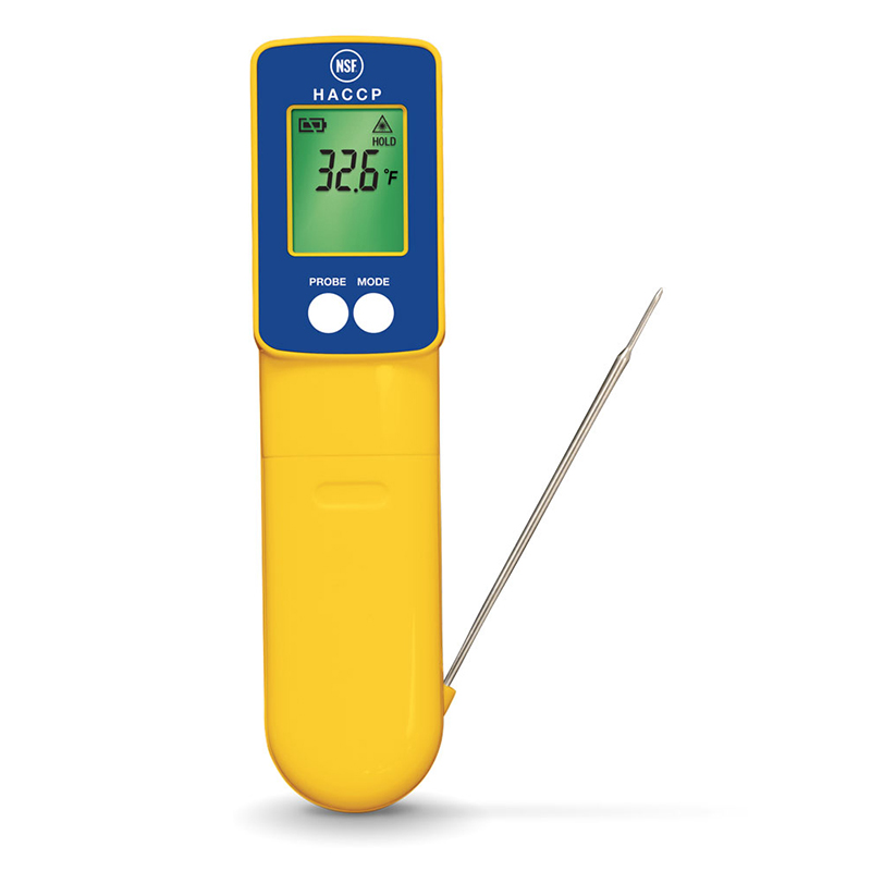 ThermoTrace® 红外线/热电偶探针组合温度计, 型号15039: 这款快速、准确的温度计非常适合在食品加工、准备、处理、送达、包装、存储、运输和接收等任何环节使用。锋利的热电偶探头尖端可测量内部温度,而红外传感器允许用户读取即时表面温度,而无需穿透测试,避免造成污染或损害测量物。它也是测量极热区,移动物体和难以到达的地方的理想选择。独特的多光束激光瞄准,可确保精确瞄准目标,绿色背光表示温度在HACCP食品安全区内,红色背光表示测量值处于食源性病原体繁殖的温度危险区域。